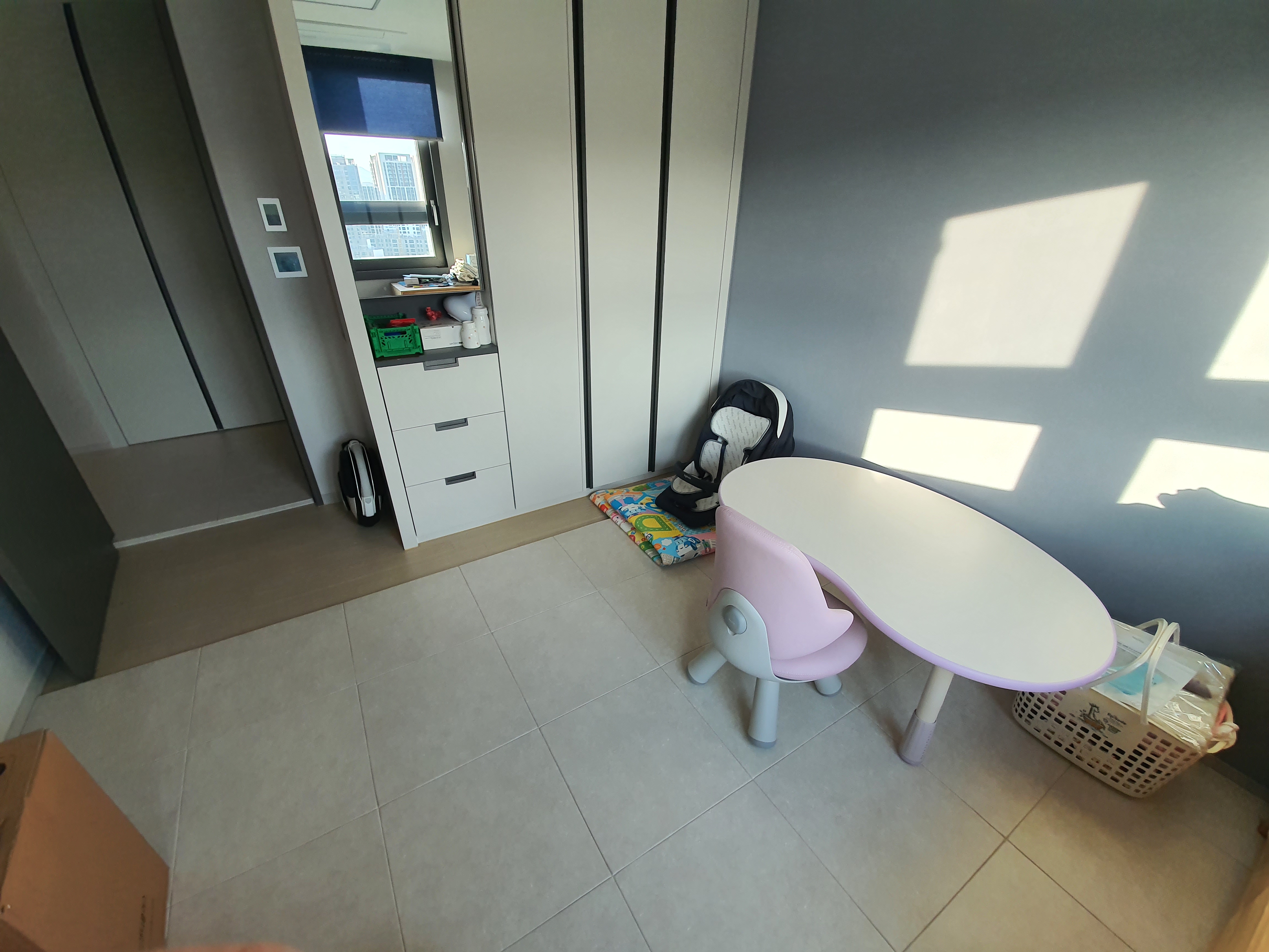 아이방에도 깔았는데, 매트 두께로 인하여 문쪽은 시공이 불가함. 그렇다고 나머지 부분을 채우는 것은 매트가 좀 아깝단 생각도 들었는데, 다행히 시공해주시는 분도 이렇게 하는 편이 깔끔하다고 추천해주셔서 그냥 이대로 시공!